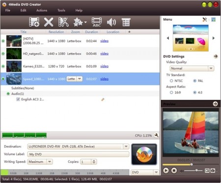 4Media DVD Creator, best movie DVD maker, has great ability to create DVD movie from various video files. Easily burn MP4 to DVD, MKV to DVD, AVI, MPEG, WMV, MP4, MTS, M2TS, iPhone 4 videos (MOV) and so on to DVD, DVD folder or ISO image file. This movie DVD maker software allows you burn DVDs with personalized DVD menu and is highly compatible with most disc formats. 4Media DVD Creator allows you to create DVD movie, DVD folder or ISO image from video files like AVI, MPEG, WMV, MP4, MTS, M2TS, MKV, etc. with a variety of DVD authoring features and supported target disc formats.