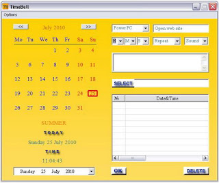 TimeBell is a application for creation of a reminder are in the one window interface. TimeBell program is simple and convenient in use. Possesses a clearinterface intuitively. The TimeBell can remind you about important events showing a notification message,by playing music, opening a document or file, or starting the program, shut down or restart PC you choice in nominated you time. Number of alarms is 30.